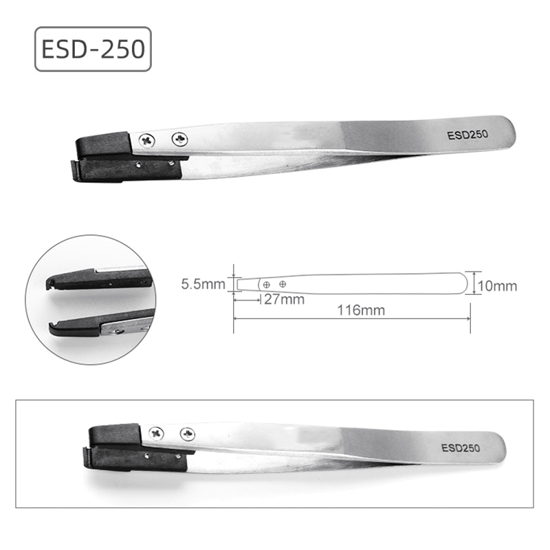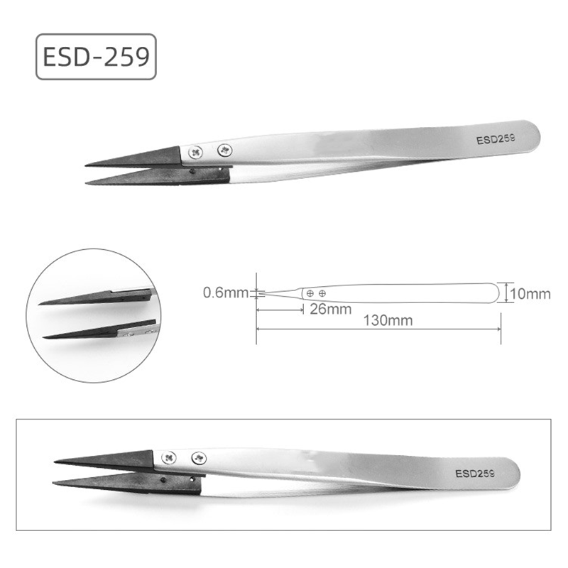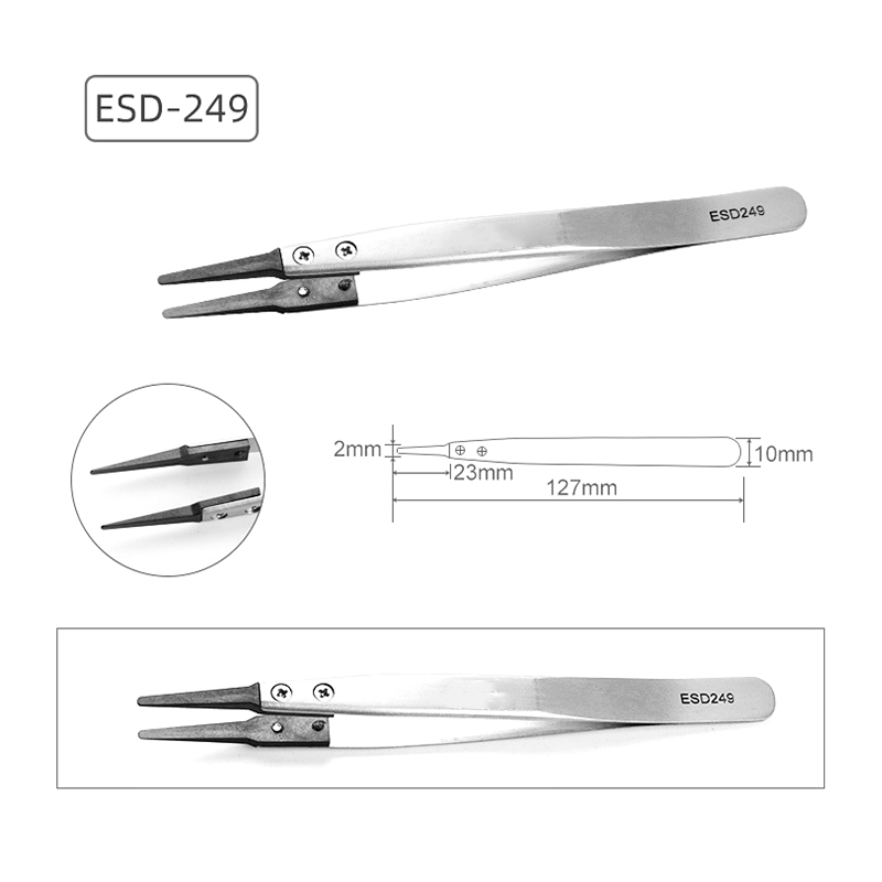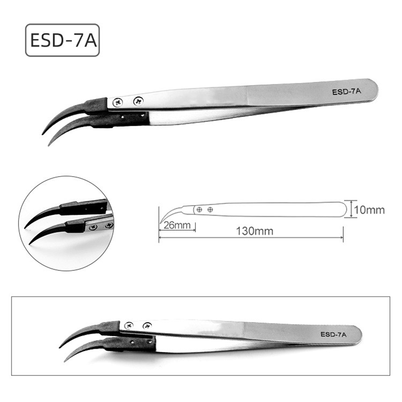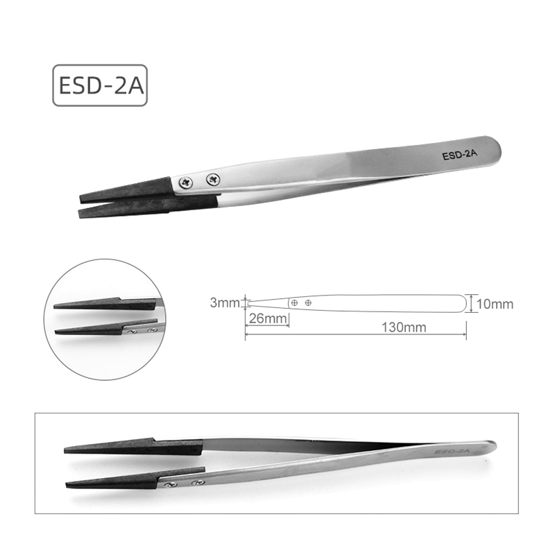 Pincetthuvudet är tillverkat av en blandning av kolfiber och speciell plast, som effektivt kan förhindra statisk elektricitetsansamling och ge en säker driftsmiljö för statiska känsliga komponenter.