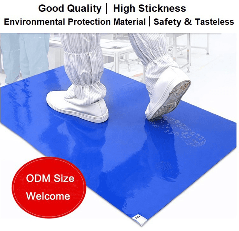 Effektivt dammborttagning: Våra klibbiga mattor är tillverkade av flerskikts lågdensitetspolyeten (PE) filmmaterial, totalt 30 lager, och varje avtagbar film är jämnt belagd med en högviskositetsbeläggning. Varje skikt har en konsekvent vidhäftning, som effektivt kan fånga damm, partiklar och smuts på sulor, hjul och andra föremål, vilket minimerar överföringen av föroreningar.